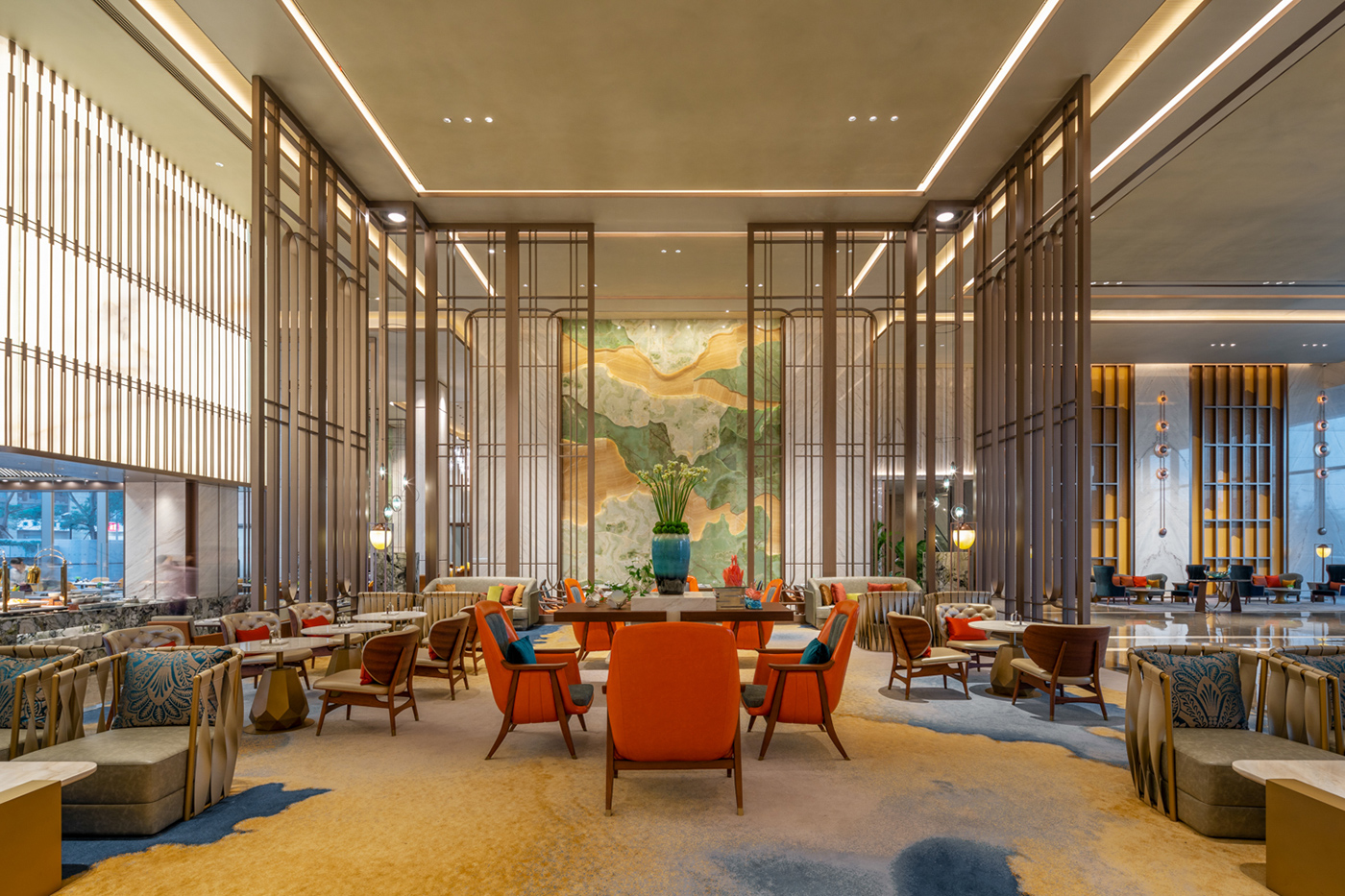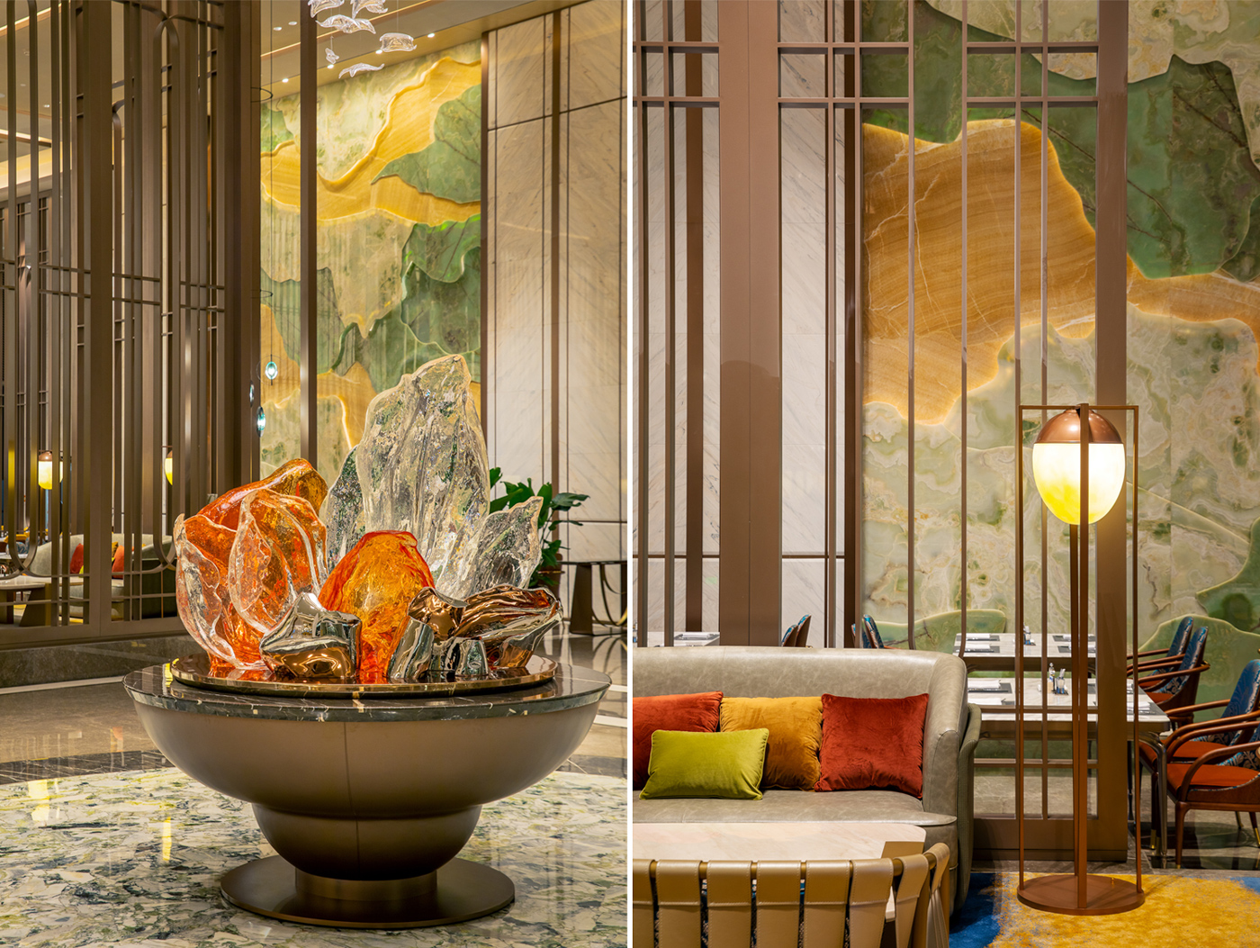 常熟日航旅馆大堂整体气概融合现代中式的精炼与日式的禅意,,,,,,,在用材上极尽考究,,,,,,,地面云朵拉灰石材外貌犹如星空般闪灼,,,,,,,与顶面的金属艺术漆相呼应;;;;;;;;墙面的白金沙,,,,,,,高尚而不失肌理感;;;;;;;;配景墙面大面积的玉石在灯光的照耀下,,,,,,,尽显轻奢、高雅。。。。。。。。