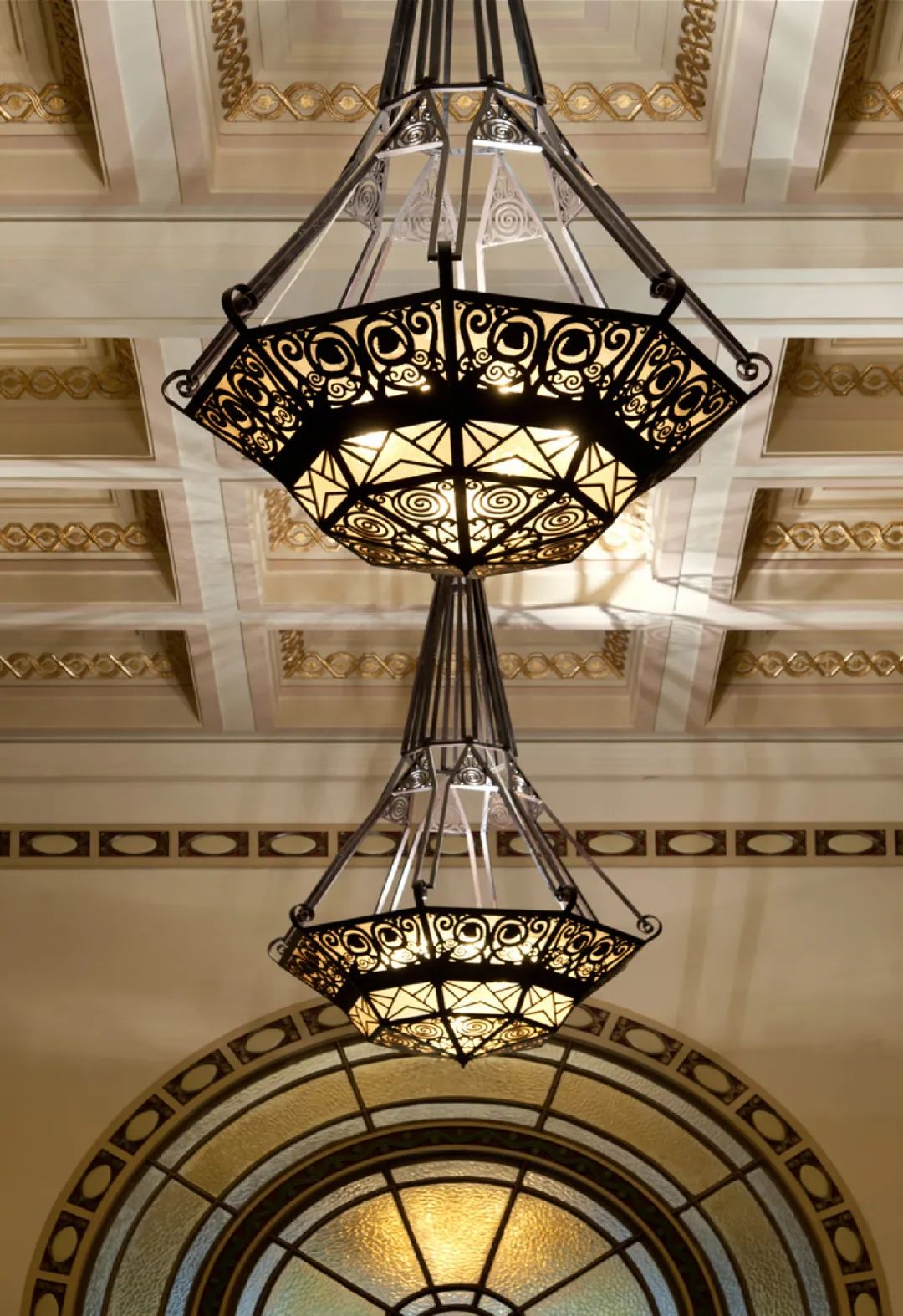 The light passes through the intricately engraved interlocking curves and V-shaped patterns on the lampshade, as breathtakingly beautiful as they are elegant.