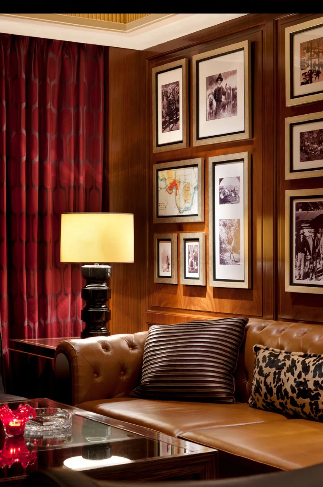 wooden wall panels and columns, and old-fashioned table lamps give an elegant, Shanghai-style vibe.