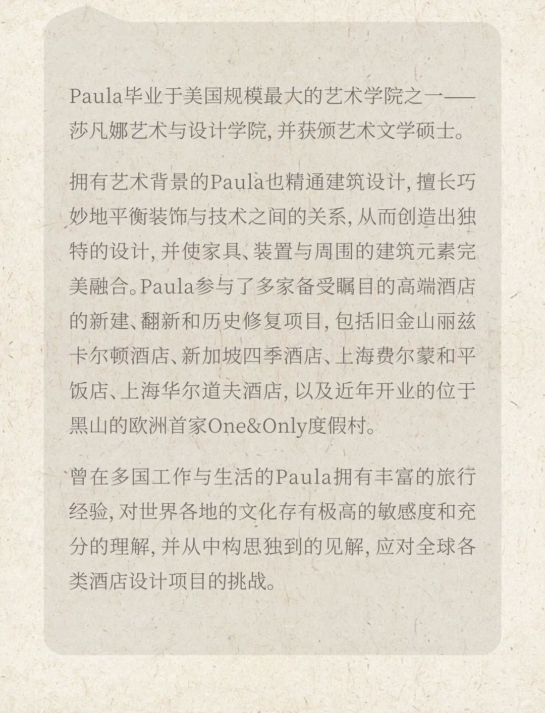 With a background in arts, Paula is also well-versed in architectural design, specializing in skillfully balancing decorative and technical aspects to create unique designs and blend furniture and fixtures seamlessly with the surrounding architectural elements. Paula has been involved in many high-profile new construction, renovation, and historic restoration projects for high-end hotels, including the Ritz-Carlton San Francisco, the Four Seasons Singapore, the Fairmont Peace Hotel Shanghai, the Waldorf Astoria Shanghai, and the One&Only Portonovi Montenegro, the first One&Only resort in Europe, which opened in recent years.